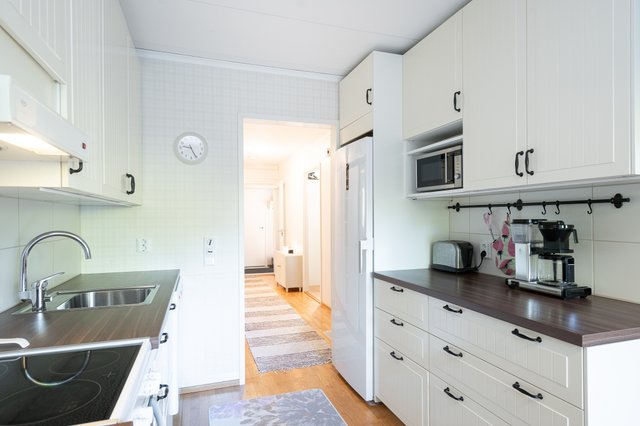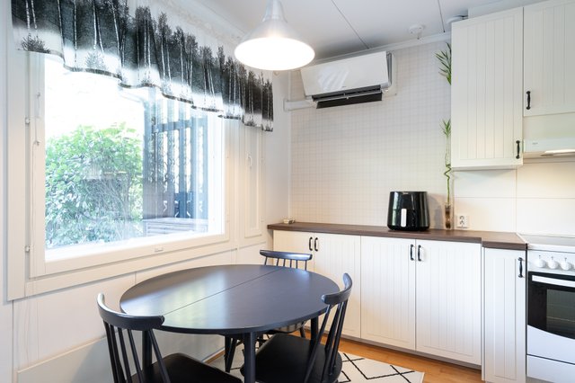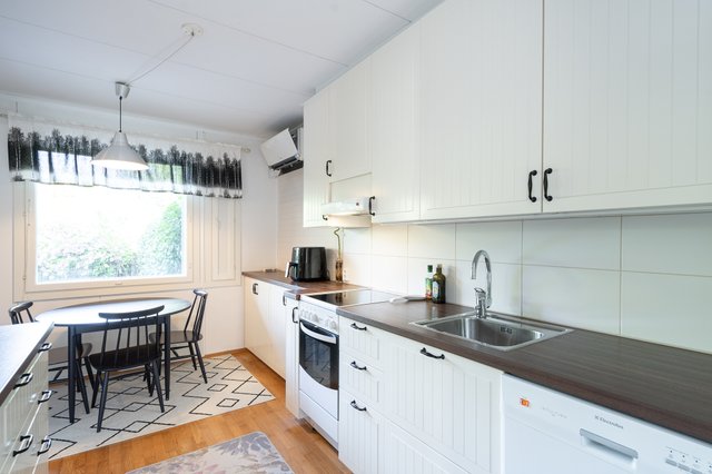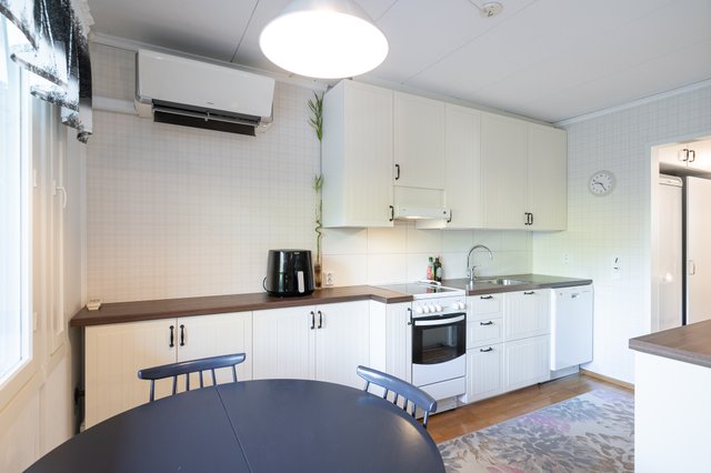 - Keittiö remontoitu kodinkoneita lukuunottamatta vuonna 2013. Vaaleat kaapin ovet, tumman ruskea laminaattitaso, välitilassa valkoinen laatoitus. Erilliset jääkaappi (uusittu 2022) ja pakastin (uusittu 2007), keraaminen liesi (uusittu 2009), liesikupu ja astianpesukone. Lattia parkettia ja seinät tapetoitu. Ruokailutilassa vuonna 2010 asennettu ilmalämpöpumppu.