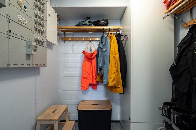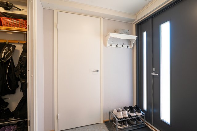 - Eteisessä laattalattia ja lattialämmitys, seinät maalattu. Eteisen yhteydessä varastohuone ja lisäksi viereisessä vaatehuoneessa on lattialämmitys.