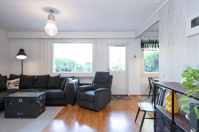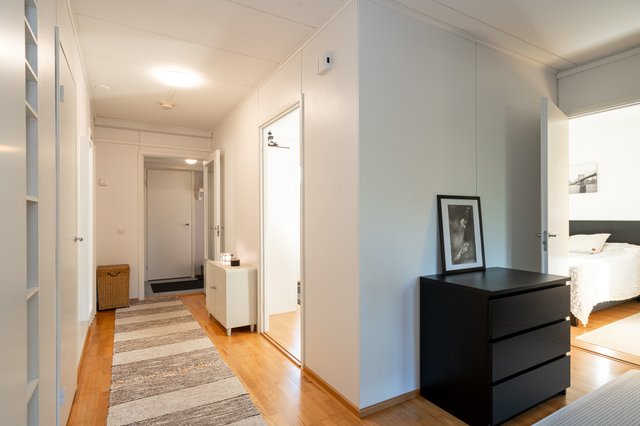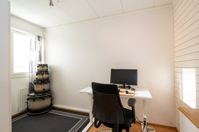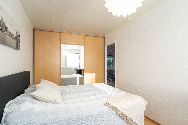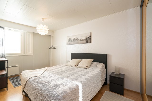 - Laminaattilattiat, seinät tapetoitu/ maalattu. Pienemmässä makuuhuoneessa raakalauta tehosteseinä. Isommassa makuuhuoneessa liukuovikaapisto, pienemmän irtokaapisto ei kuulu kauppaan.
