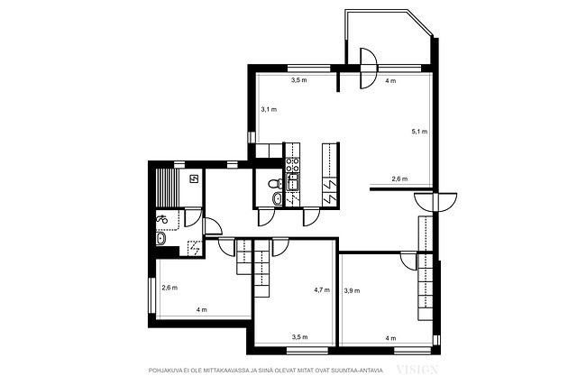 - Ei tarkistusmitattu. Pinta-alat saattavat tämän ikäisissä kohteissa (yhtiö rekisteröity ennen 01.01.1992) poiketa olennaisestikin asuinrakennusten nykyisten mittaustapojen ja standardien (SFS 5139) mukaan laskettavasta asuintilojen pinta-alasta. Pinta-ala voi siis olla edellä mainittua pienempi tai suurempi.
