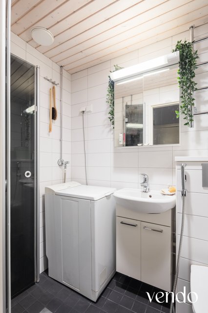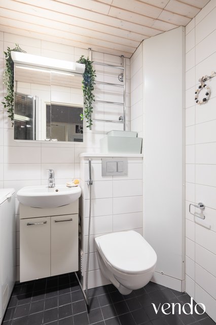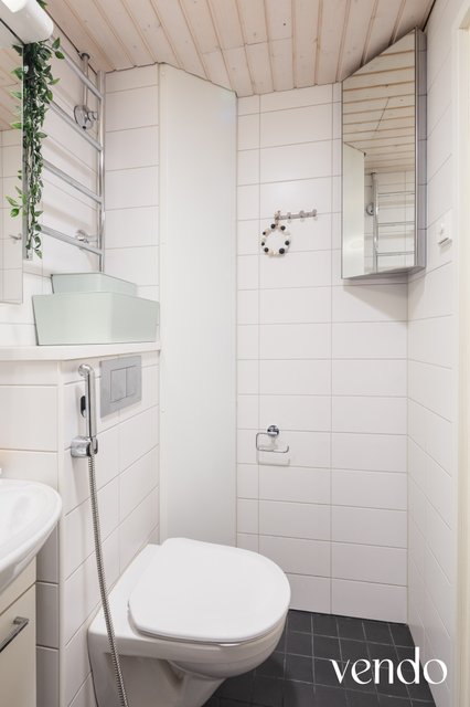 - WC-istuin, suihku, suihkuseinä, pesukoneliitäntä, peilikaappi, pesuallas, allaskaappi, bidee-suihku, lattialämmitys, ja pyyhekuivain