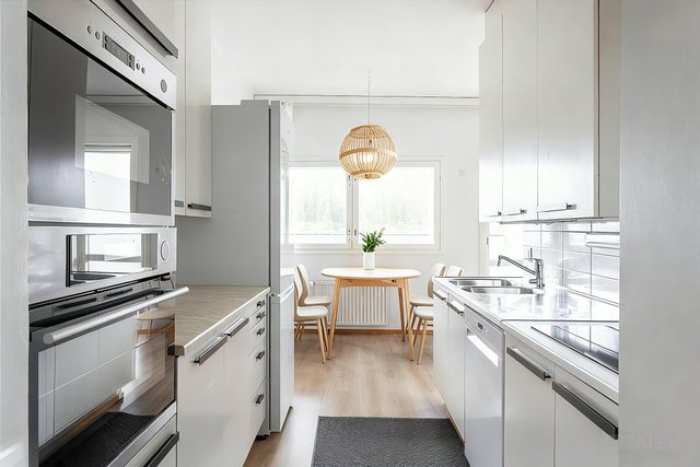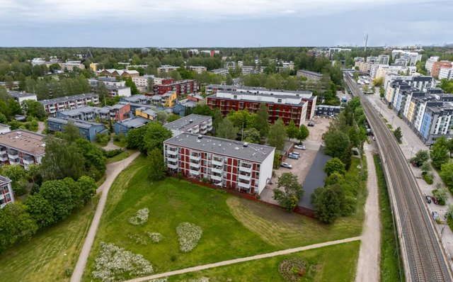 Kannelmäki offers excellent services and transport connections. The nearest train station is only about 200 meters away, and a bus stop is within a short walking distance. Local grocery stores and the Kaari shopping center are also conveniently nearby. The area has several daycare centers and schools, making it an ideal location for families.
