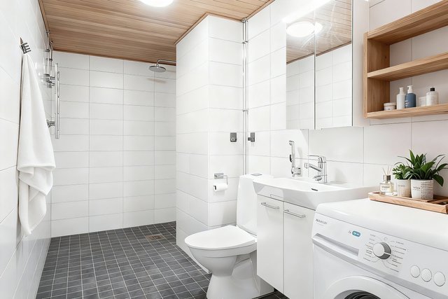 - WC-istuin, suihku, pesukoneliitäntä, peilikaappi, pesuallas, allaskaappi, ja bidee-suihku