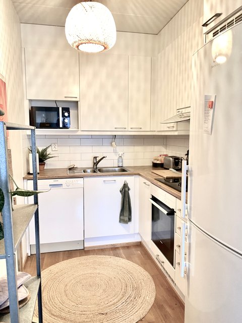 Keittiössä on kaikki tarvittava arjen sujuvuuteen, kuten jääkaappi-pakastin ja astianpesukone. Olohuone ja makuuhuone ovat viihtyisiä, ja niiden parkettilattiat tuovat lämpöä sisustukseen. Kylpyhuoneessa on tila ja liitännät pesukoneelle, mikä helpottaa pyykkihuoltoa.
