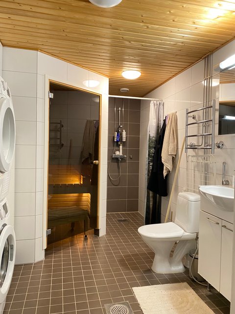 - WC-istuin, suihku, pesukoneliitäntä, peilikaappi, ja allaskaappi