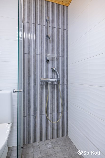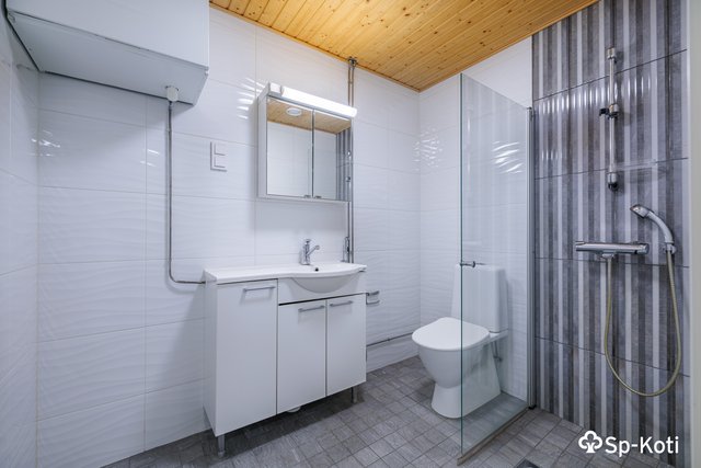 - Peilikaappi, pesukoneliitäntä, suihkuseinä, suihku, wc-istuin, allaskaappi, pesuallas, bidee-suihku, ja lattialämmitys