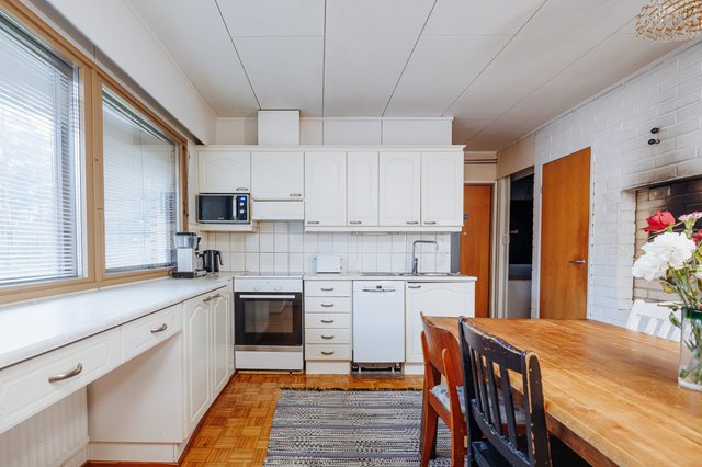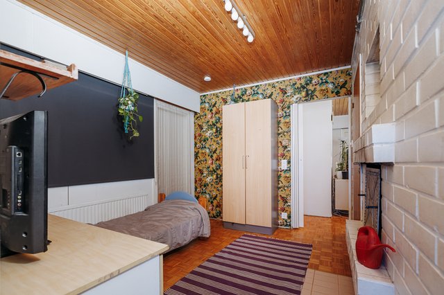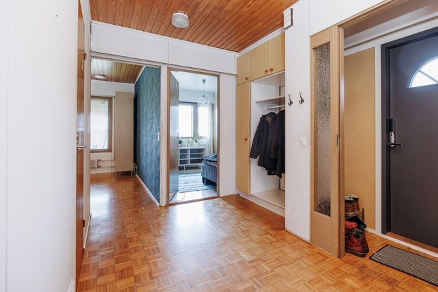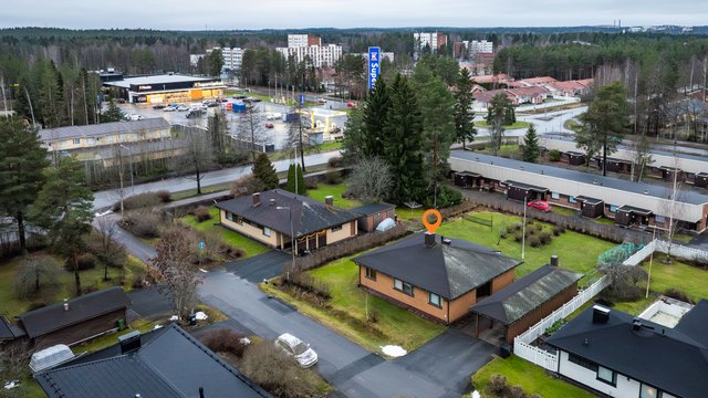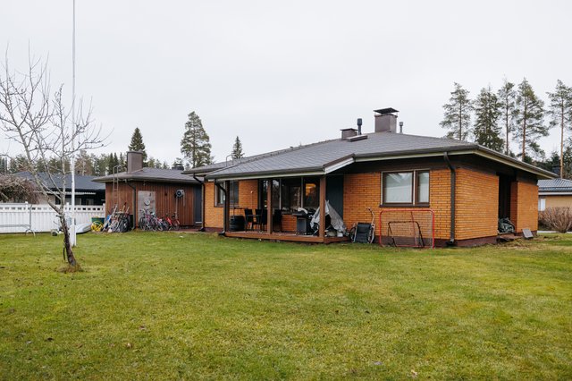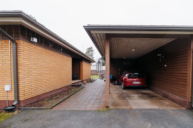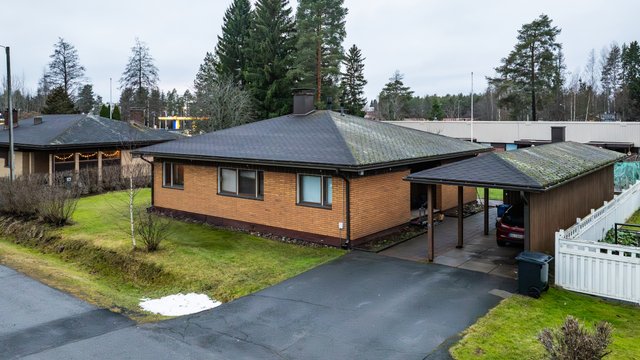 Tässä kodissa makuuhuoneet on sijoitettu talon kulmiin. Erillinen keittiö ja olohuone, keittiössä runsaasti kaappi- ja laskutilaa. Olohuoneesta kulku länsisuuntaiselle katetulla terassille. Tontilla on kokoa yli 1000 m², takapihalla hyvin tilaa peleille, leikeille tai vaikkapa puutarhanhoitoon. Erillinen autokatosrakennus, jonka yhteydessä tekninen tila sekä ulkovarasto.