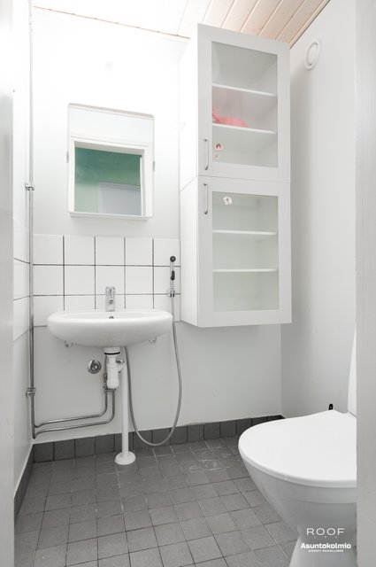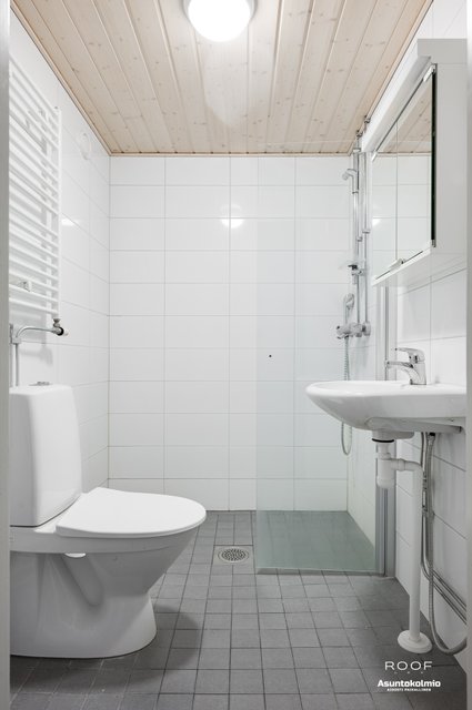 - WC-istuin, suihku, suihkuseinä, pesukoneliitäntä, peilikaappi, pesuallas, ja rättipatteri