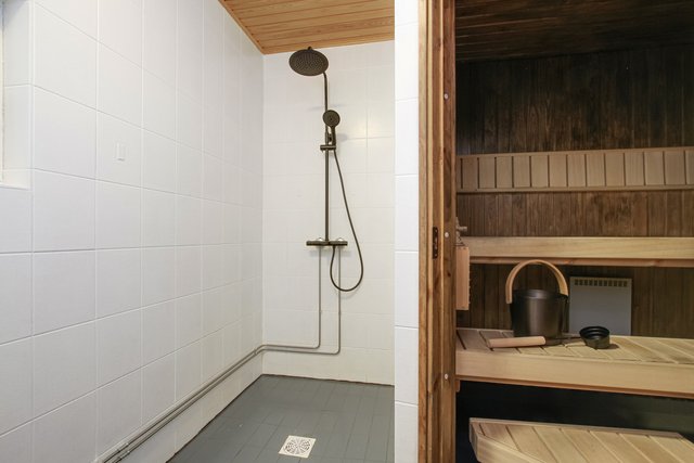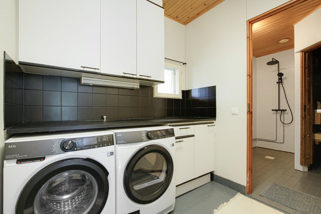 - Pesukoneliitäntä, pöytätaso, lattialämmitys, lattiakaivo, pyyhekuivain / seinäpatteri, silityspöytä/taso, ja pyykkikaapit