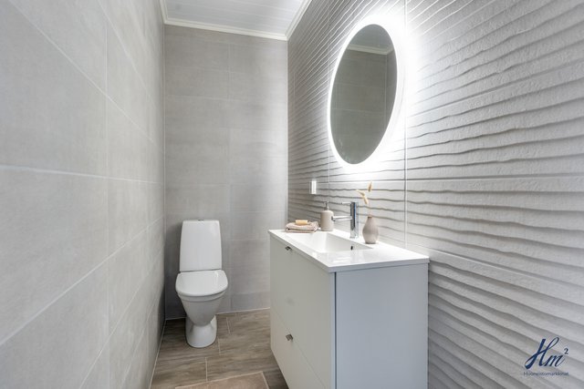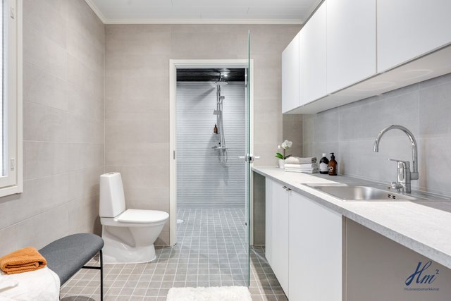 - Pesukoneliitäntä, lattialämmitys, pesuallas, pyykkikaapit, ja pöytätaso