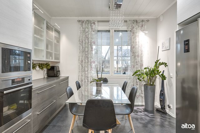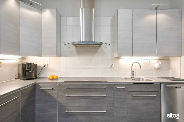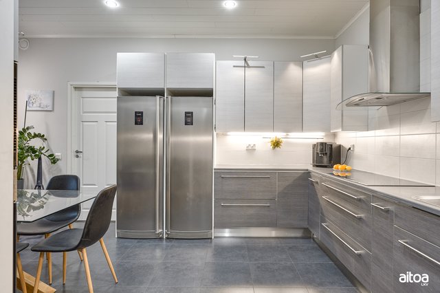 - Jääkaappi, pakastin, liesituuletin, induktioliesitaso, erillisuuni, integroitu mikroaaltouuni, astianpesukone, sähköinen lattialämmitys.