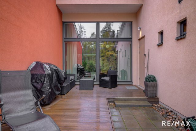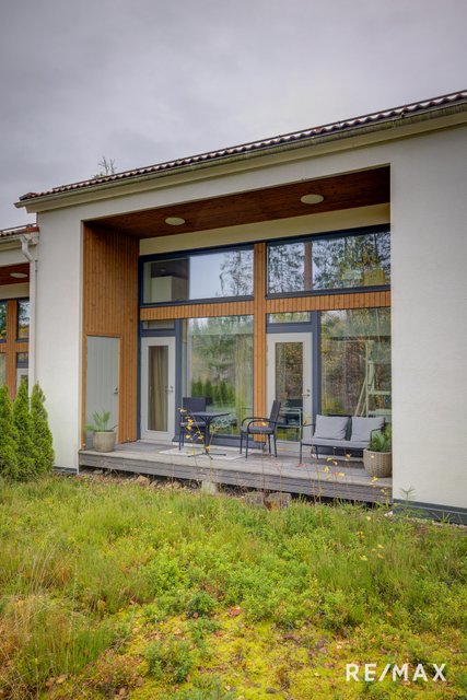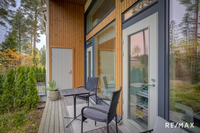 - Huoneiston molemmilla puolilla on terassit. Sisäänkäynnin yhteydessä terassi ja osin katettu terassi. Molemmista makuuhuoneista käynti katetulle terassille, joka avautuu luonnon tilassa olevaan lähivirkistyalueeseen (VL).