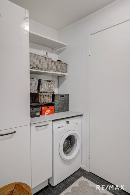 KODINHOITOTILA eteisen yhteydessä. Tilassa liitännät pyykinpesukoneelle ja kuivausrummulle.