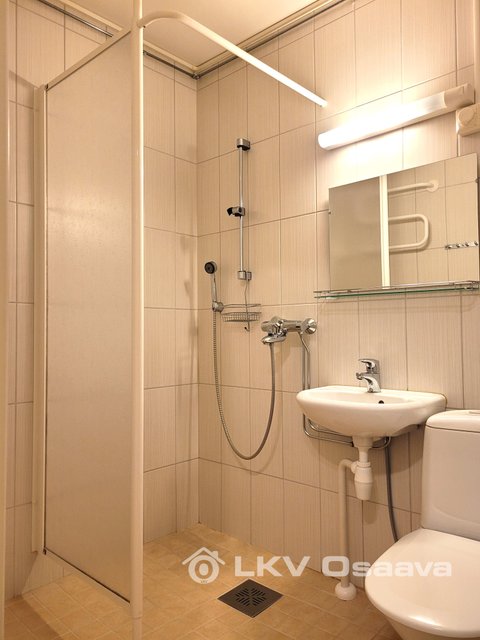 - WC-istuin, suihku, suihkuseinä, pesukoneliitäntä, pesuallas, peili, lattialämmitys (sähkötoiminen), bidee-suihku, ja seinäkaappi ja sähkötoiminen rättipatteri