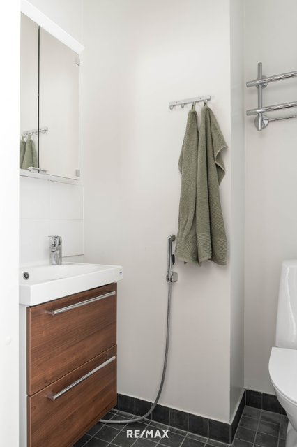 - Pesukoneliitäntä, wc-istuin, peilikaappi, suihku, pesuallas, ja allaskaappi