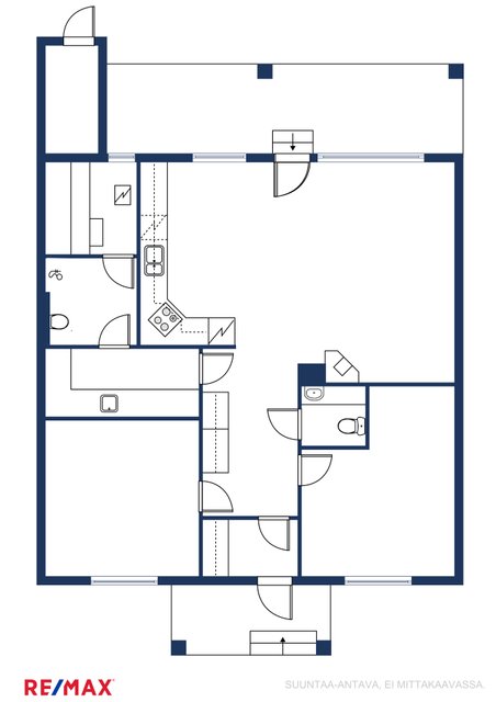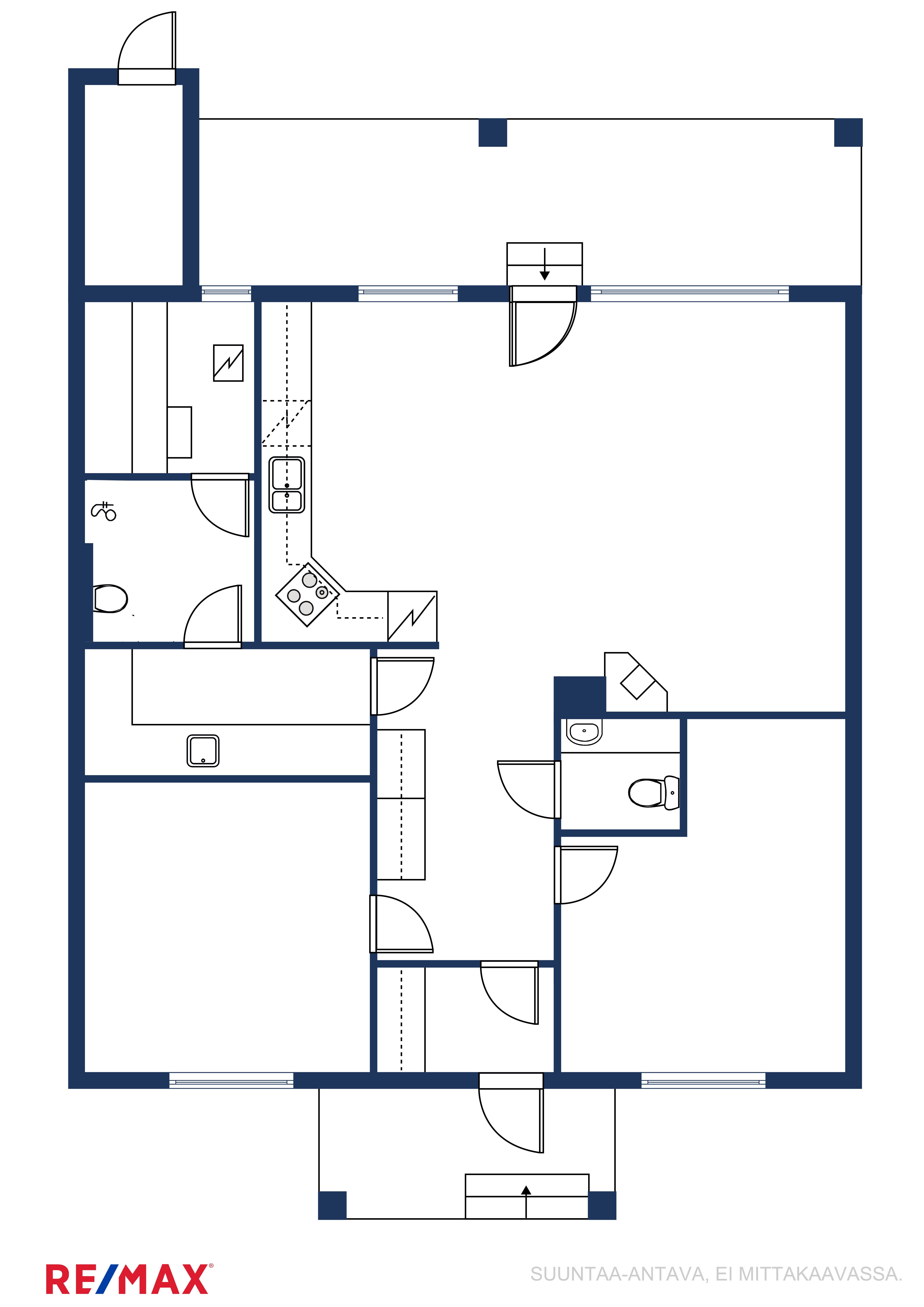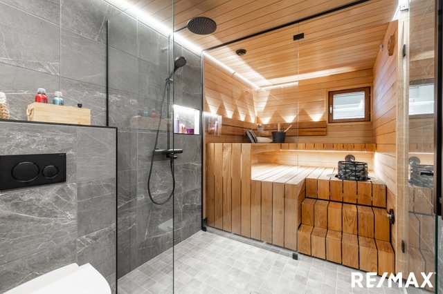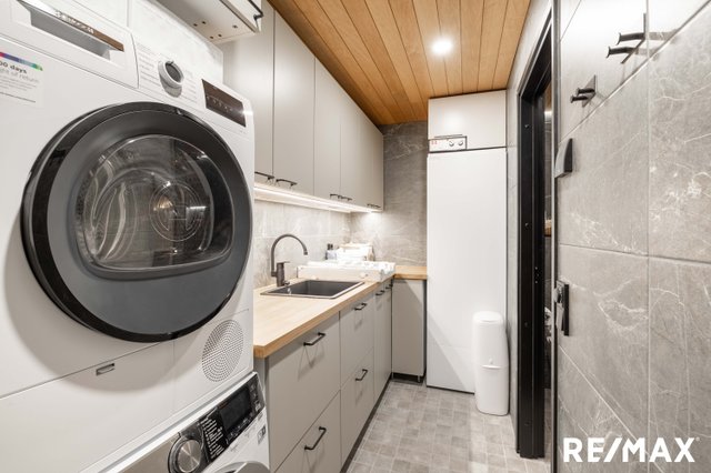 - Pesukoneliitäntä, pyykkikaapit, lattialämmitys, pöytätaso, pesuallas, lattiakaivo, tila pesutornille, ja lto