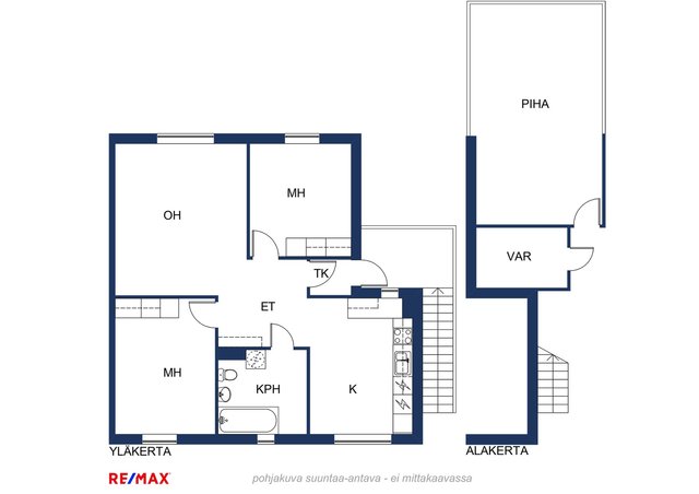 Toisen kerroksen asunto tarjoaa toimivan ja selkeän pohjaratkaisun: kaksi makuuhuonetta, tilava olohuone, erillinen keittiö sekä kylpyhuone. Asunnon sisäänkäynnissä on suojaisa kuisti ja käytössäsi on myös oma piha.