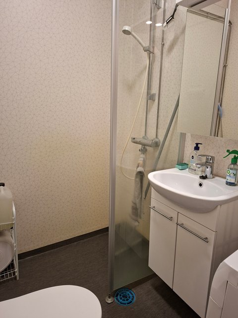 - WC-istuin, suihkuseinä, suihku, pesukoneliitäntä, allaskaappi, ja peilikaappi