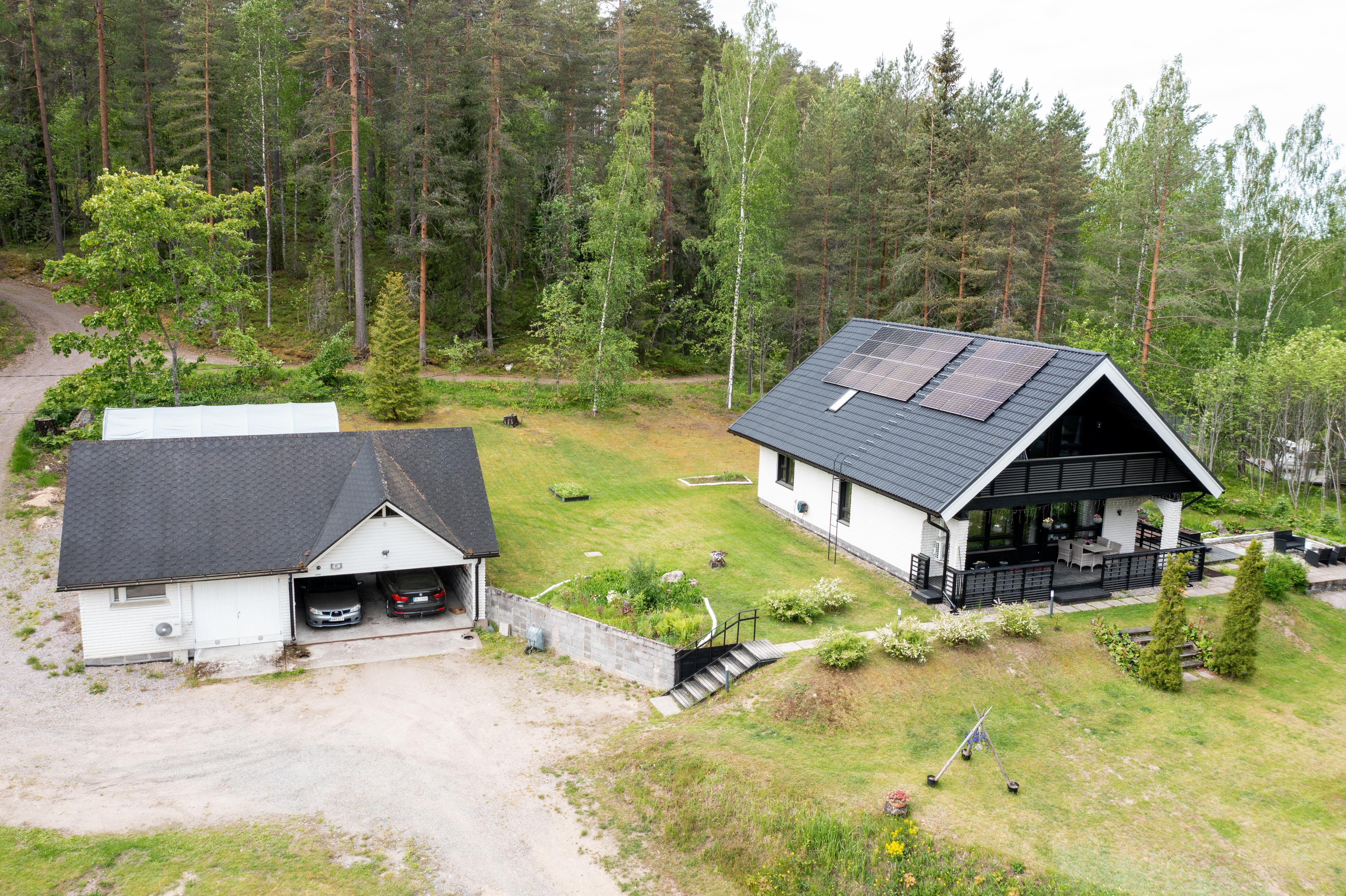parveke järvelle päin. Yläkerrassa on tilava WC. Yläkerran avaruutta lisää huikea harjakattomainen muoto. Pihassa myös poreallas jossa nautit kiireisen arjen keskellä.