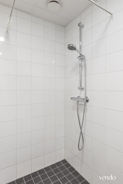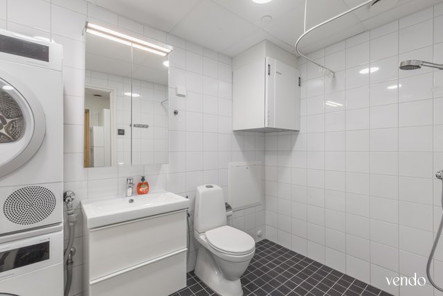 - WC-istuin, suihku, lattialämmitys, pesukoneliitäntä, peilikaappi, peili, pesuallas, allaskaappi, ja bidee-suihku
