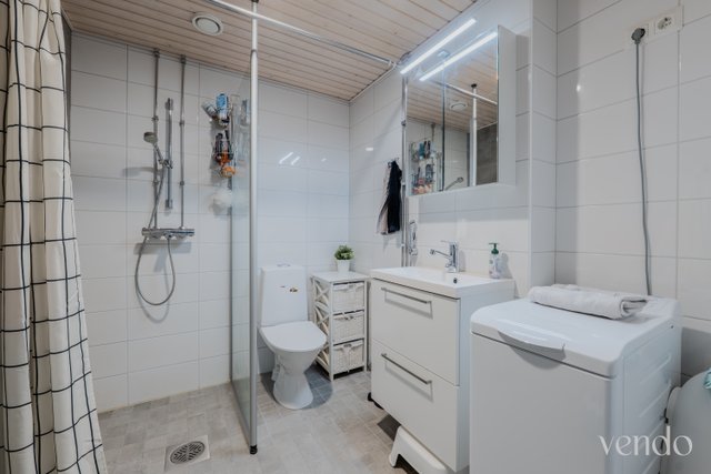 - WC-istuin, suihku, suihkuseinä, pesukoneliitäntä, lattialämmitys, peili, pesuallas, allaskaappi, ja bidee-suihku