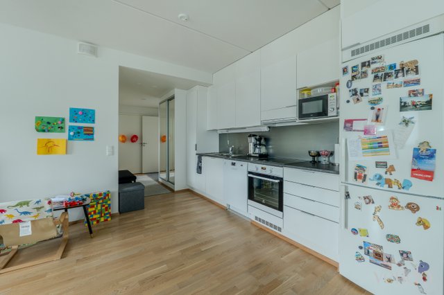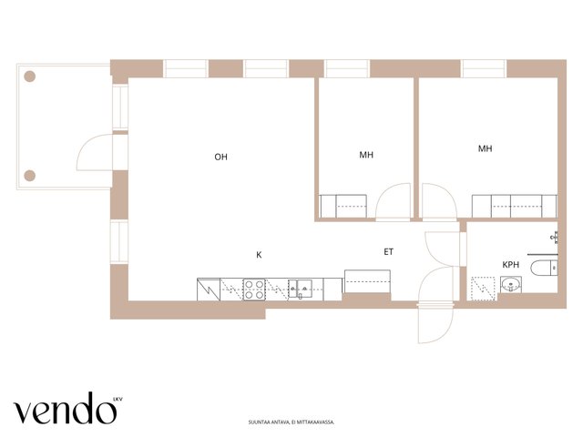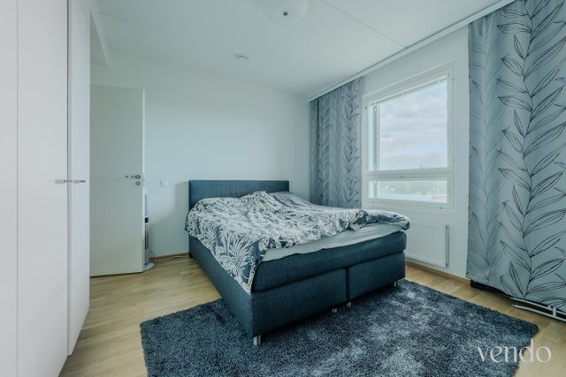 Asunnossa on kaksi makuuhuonetta ja avara olohuone-keittiöyhdistelmä, jossa on kaikki tarvittavat kodinkoneet.