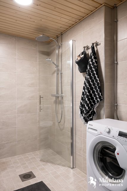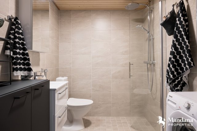 - VARUSTUS: Sadesuihku, lasinen käännettävä suihkuseinä, pesuallas, hana, bidee-suihku, wc-istuin, pesukoneliitäntä, peilikaappi, pesuallas, allaskaluste, lattialämmitys. SEINÄT / LATTIA: Laatta.
