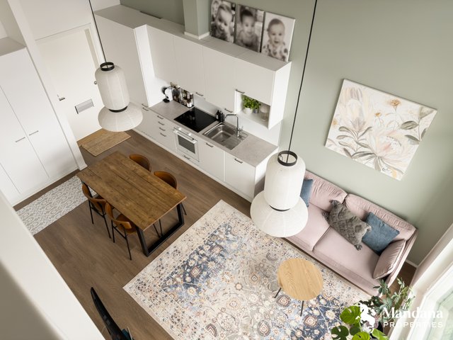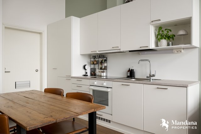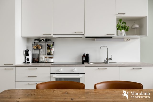 - Olohuoneen kanssa yhdistyvä avokeittiö. VARUSTUS: Integroitu jääkaappipakastin, erillisuuni, liesi, liesituuletin (aktiivihiilisuodattimella), pesuallas, hana, integroitu astianpesukone, kaapistot, kiinteä valaistus. SEINÄT: Maali. VÄLITILA: Välitilalevy. TYÖTASO: Laminaatti. LATTIA: Vinyylilankku.