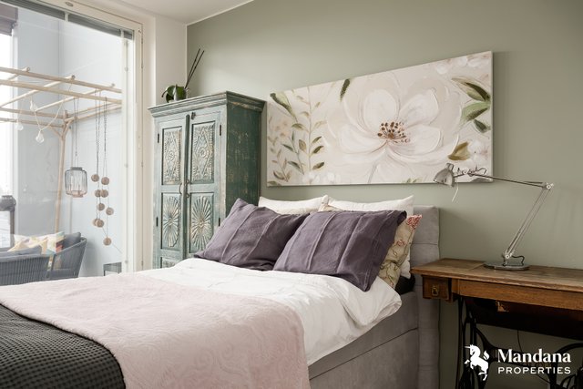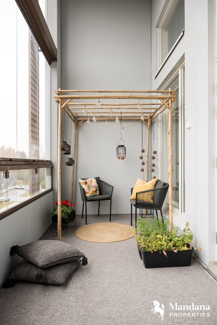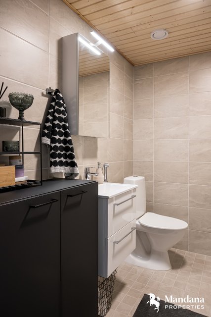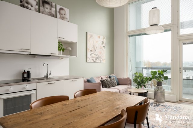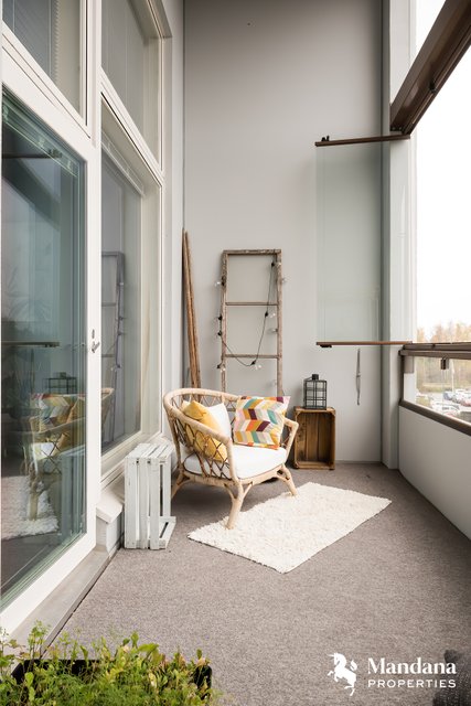 Kylpyhuone on tilava ja moderni, ja asunnon ehdoton kruunu on iso 11,5 m² lasitettu parveke, joka avautuu länteen ja kylpee ilta-auringossa. Parvekkeelta avautuvat upeat, esteettömät näkymät kattojen yli aina Jumbon suuntaan. Tämä asunto on kokonaisuus, jossa jokainen neliö on suunniteltu harkiten – yhtiön paras yksilö omassa kokoluokassaan.