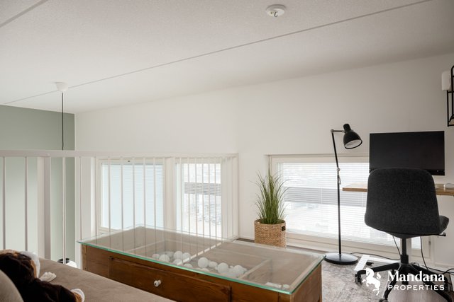 Tässä ylimmän, neljännen kerroksen upeassa loft-asunnossa yhdistyvät näyttävyys, toimivuus ja valo. Lattiasta kattoon ulottuvat ikkunat ja noin viiden metrin huonekorkeus tuovat tilaan avaruutta ja ilmettä. Pohjaratkaisu on poikkeuksellisen tehokas – 7,5 m² käytännöllinen parvi toimii erinomaisesti makuu- tai työtilana.