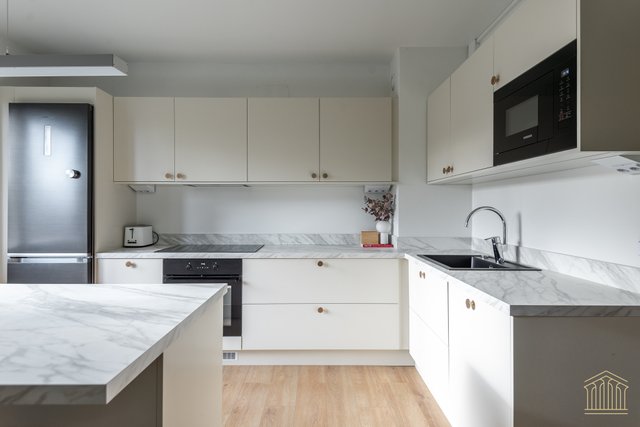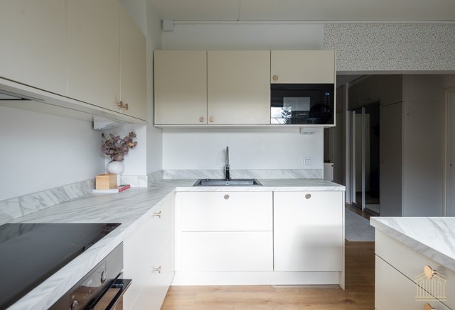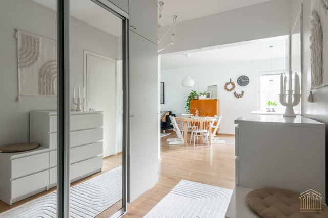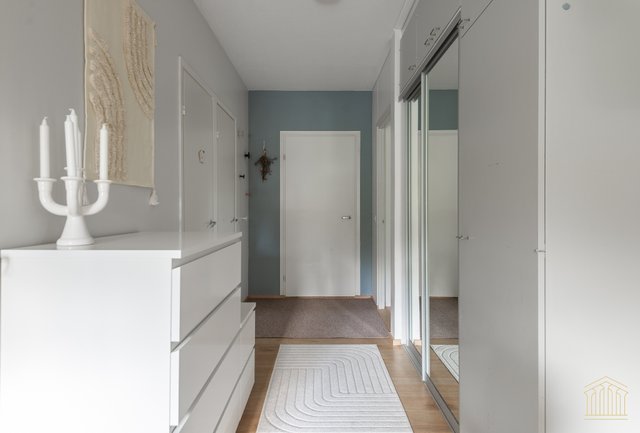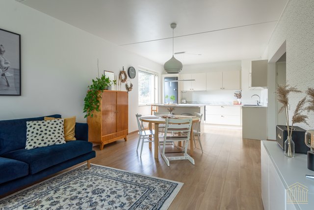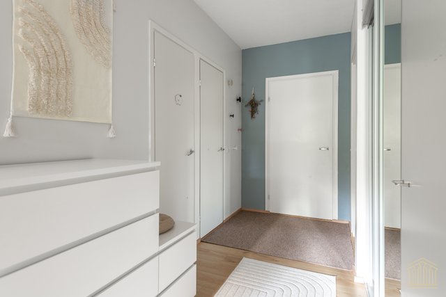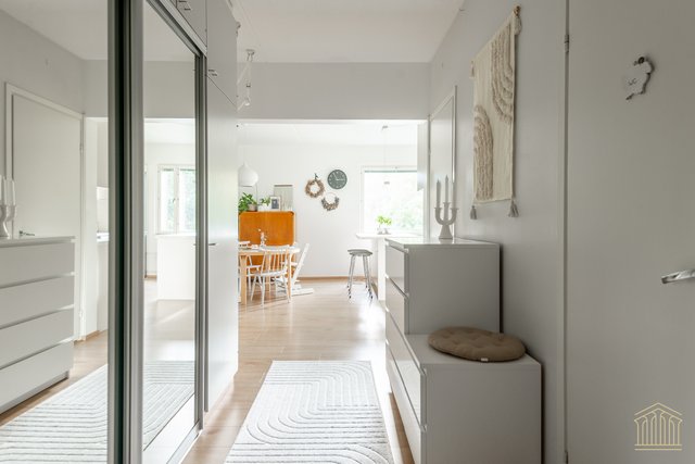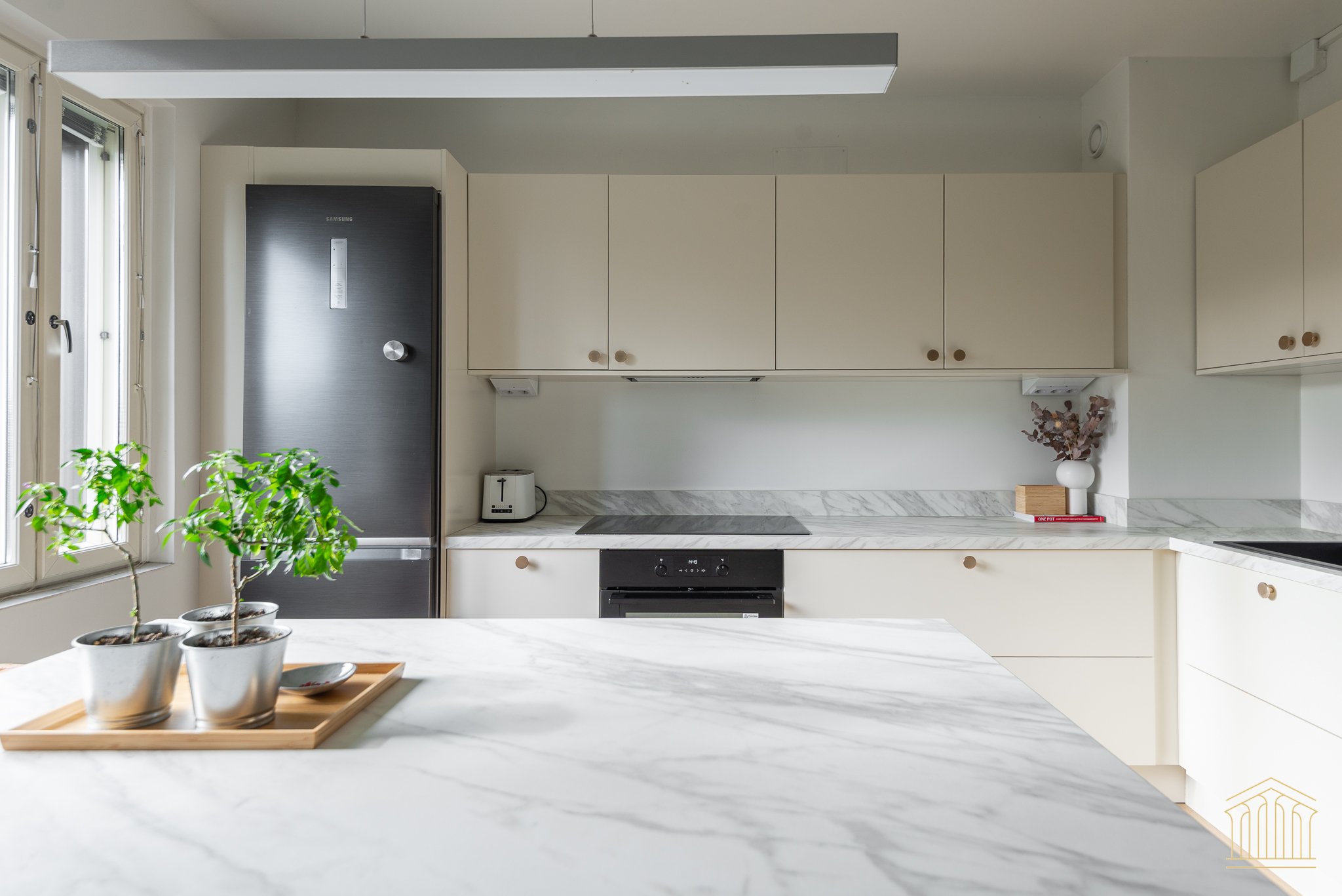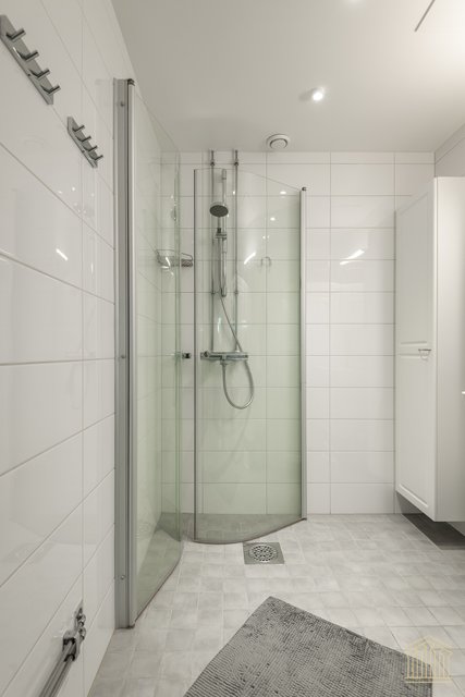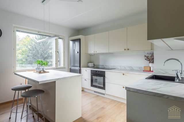 Asunnossa on erittäin toimiva pohjaratkaisu, jossa yhdistyvät käytännöllisyys ja estetiikka. Vaalea avokeittiö hurmaa tyylikkyydellään ja keittiösaareke tekee tilasta sekä näyttävän että käytännöllisen. Lattiamateriaalina on laadukas hybridilattia, joka kestää aikaa ja käyttöä. Kyseessä on kulmahuoneisto, joten ikkunapinta-alaa on kahteen suuntaan, josta luonnonvalo pääsee kauniisti sisään ja tekee kodista ihanan valoisan.