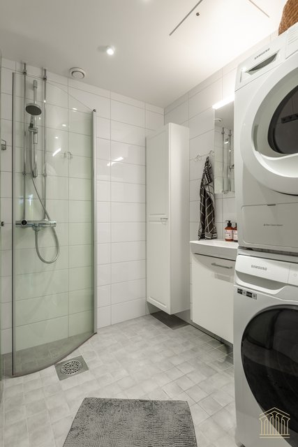 - Suihku, suihkuseinä, lattialämmitys, pesukoneliitäntä, pesuallas, peilikaappi, ja allaskaappi