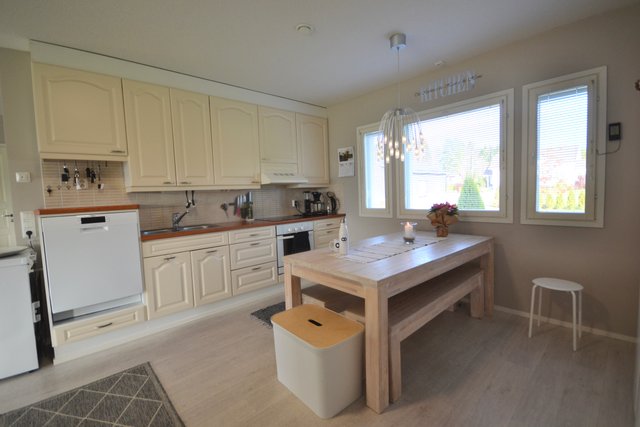 - Jääkaappi, erillinen pakastin, liesituuletin, liesi, keittiösaareke, ja astianpesukone