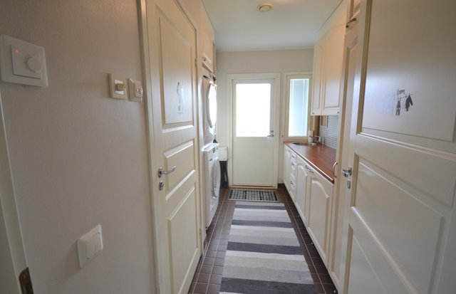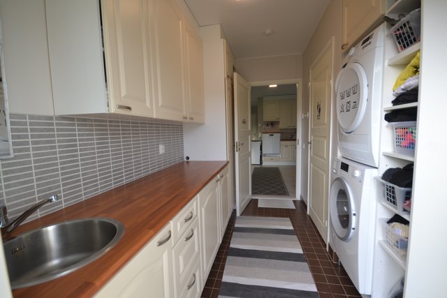 - Pesukoneliitäntä, lattiakaivo, lattialämmitys, pyykkikaapit, kurapiste, tila pesutornille, ja pesuallas