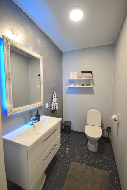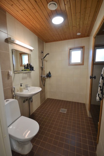 - WC-istuin, suihku, lattialämmitys, peili, allaskaappi, ja pesuallas