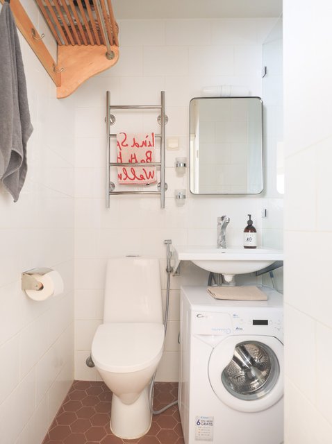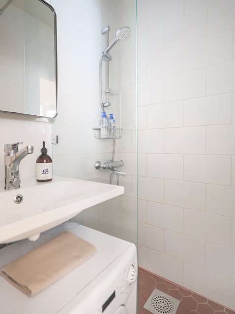 - VARUSTUS: Suihku, Suihkuseinä, Wc istuin, Pesukoneliitäntä, Pyykinpesukone, Hana, Allas, Peilikaappi, Lattialämmitys (sähkö). LATTIA: Laatta. SEINÄT: Kaakeli.