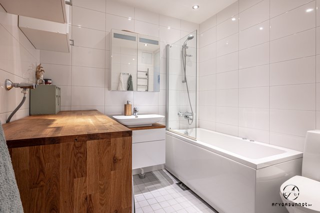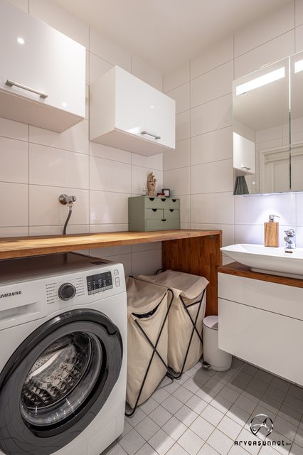Kylpyhuoneessa on arjen luksusta. Poreamme houkuttelee rentoutumaan, ja tilat on suunniteltu niin, että myös pesukone ja kuivausrumpu mahtuvat rinnakkain. Vaaleat pinnat ja puiset yksityiskohdat viimeistelevät harmonisen kokonaisuuden.