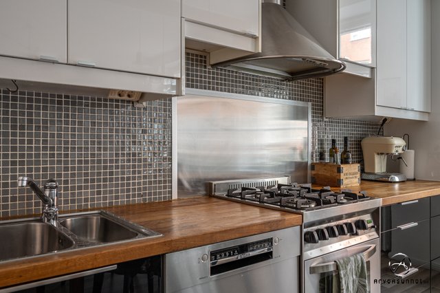 Keittiö jatkaa kodin linjaa: se on käytännöllinen, valoisa ja tyylikäs. Laadukkaat pinnat, kaasuliesi ja hyvin suunnitellut kaapistot tekevät ruoanlaitosta nautinnollista. Ruokailutilaan mahtuu isompikin seurue, ja tunnelma säilyy kutsuvana.