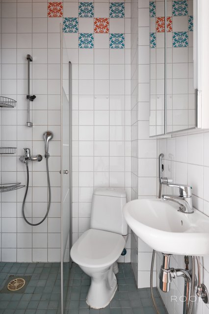 - WC-istuin, suihku, suihkuseinä, bidee-suihku, pesuallas, peilikaappi, ja pesukoneliitäntä