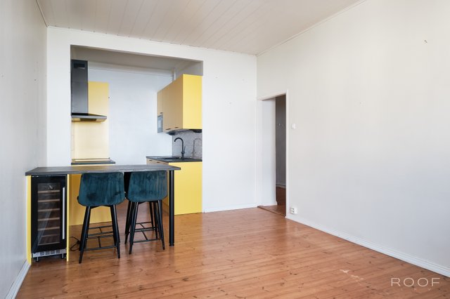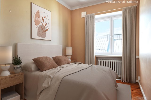 Tähän huoneistoon tunnelmaa luovat lautalattiat, jykevät ikkunalaudat sekä suuret ikkunat. Huonekorkeus lisää avaruuden tuntua. Vuonna 2022 remontoidussa Puustellin keittiössä on integroidut kodinkoneet sekä reilusti kaappi- ja laskutilaa. Pöytätason yhteydessä on mukavuutena AEG:n viinikaappi. Tilava olohuone tarjoaa mahdollisuuden viihtyisän oleskelutilan sisustamiseen. Kylpyhuoneessa on paikka pyykinpesukoneelle ja arkea helpottaa myös taloyhtiön maksuton pesutupa. Asukkaiden käytössä on lisäksi sauna. Makuuhuoneessa on paikka kaapistolle ja lisää säilytystilaa on eteisen komeroissa sekä huoneistolle kuuluvissa ullakko- ja kellarikomeroissa.