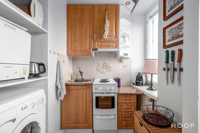 Asunnossa on tehokas pohjaratkaisu ja tilava olohuone, jossa suuret ikkunat tuovat runsaasti valoa. Alkovissa on tilaa leveälle sängylle, ja kompakti keittiö sisältää kaiken tarpeellisen – astianpesukoneen ja pyykinpesukoneen mukaan lukien. Asunnossa on hyvin kaappitilaa, ja kylpyhuoneessa on suihkutila sekä pyyhekuivain.