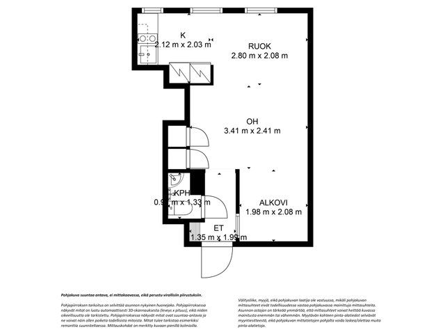 - Huoneiston pinta-ala on yhtiöjärjestyksen, isännöitsijäntodistuksen ja myyjän ilmoituksen mukaan 31m². Pinta-alaa ei ole tarkistusmitattu. Edellä mainittu pinta-ala saattaa tämän ikäisessä kohteessa poiketa olennaisestikin huoneiston nykyisen ja rakentamisaikaisen mittaustapojen ja standardien mukaan laskettavasta pinta-alasta. Huoneiston todellinen pinta-ala voi siis olla yhtiöjärjestyksessä, isännöitsijäntodistuksessaja esitteessä mainittua pienempi tai suurempi.