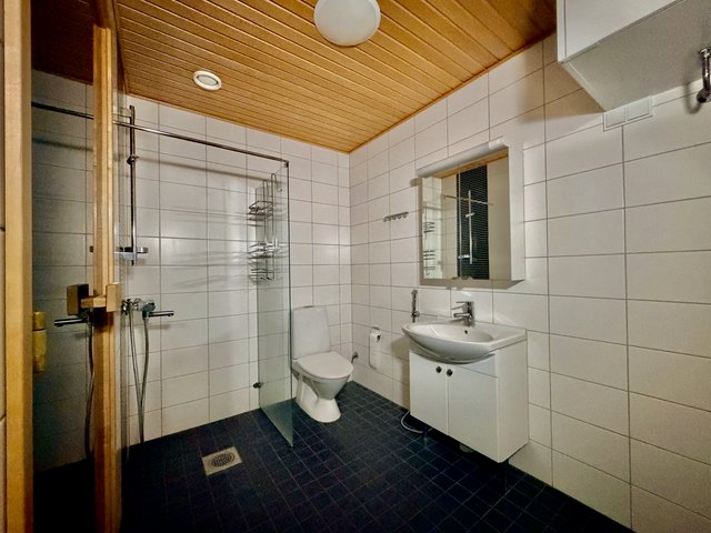 - WC-istuin, suihku, suihkuseinä, pesukoneliitäntä, lattialämmitys, peilikaappi, pesuallas, ja bidee-suihku