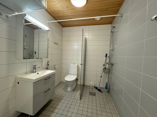 - WC-istuin, suihku, suihkuseinä, pesukoneliitäntä, pesuallas, peilikaappi, allaskaappi, bidee-suihku, ja lattialämmitys