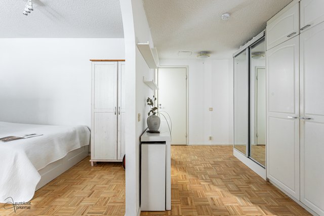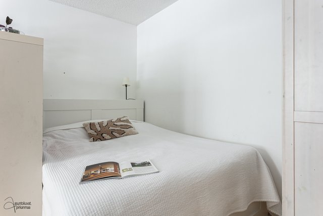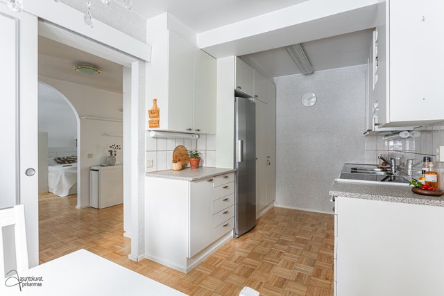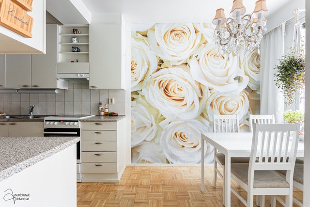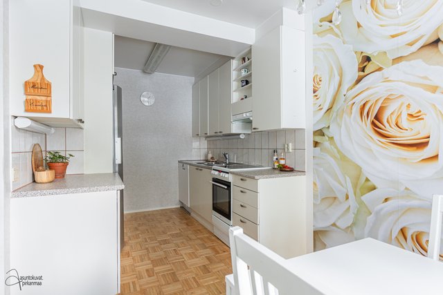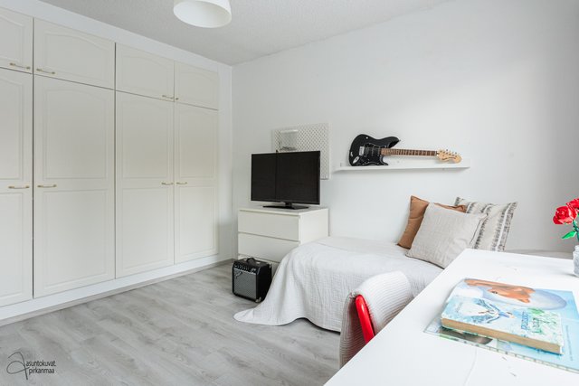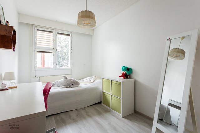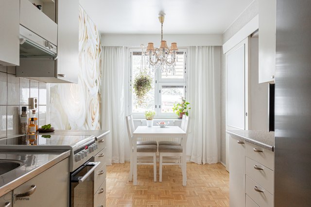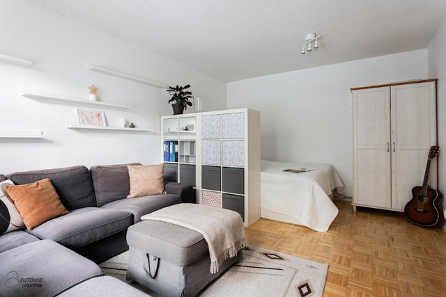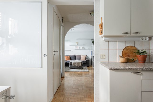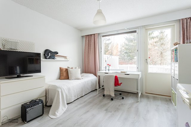 Tämän kodin pohjaratkaisu on selkeä ja huoneet hyvänkokoisia. Valoisa olohuone on tilava ja erilliseen keittiöön mahtuu hyvin ruokapöytä. Makuuhuoneet ovat takapihan puolella ja ikkunoista onkin rauhallisen metsäiset näkymät. Asunto sopii loistavasti niin sinkulle, pariskunnalle kuin pienelle perheellekin.