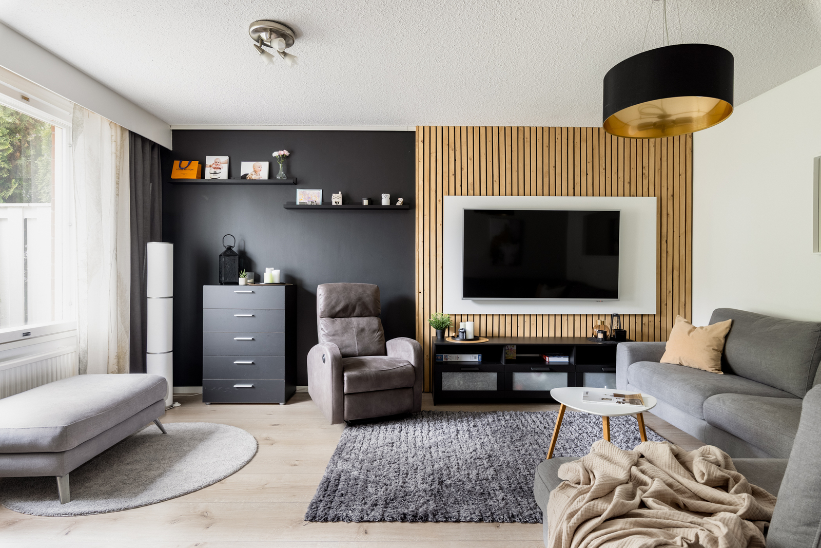- Nayttävä rimaseinä, isot ikkunat omalle pihalle.