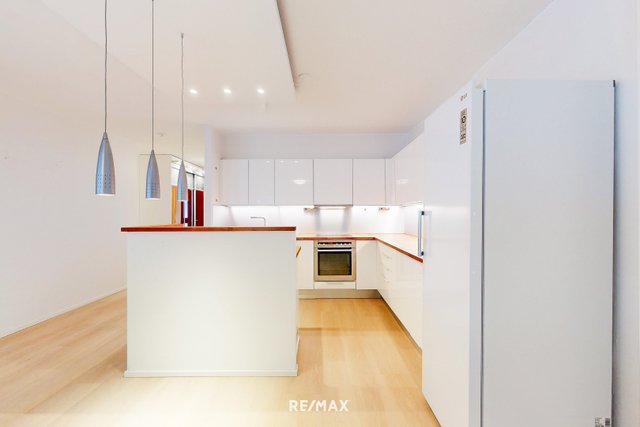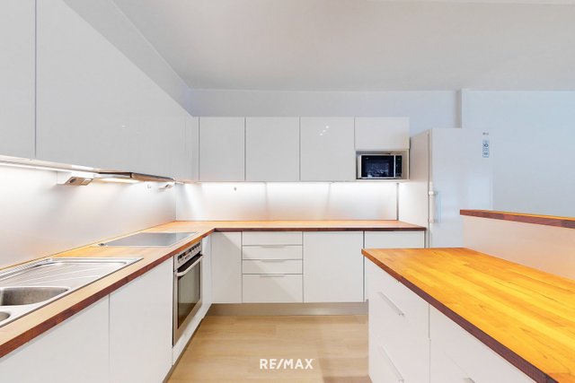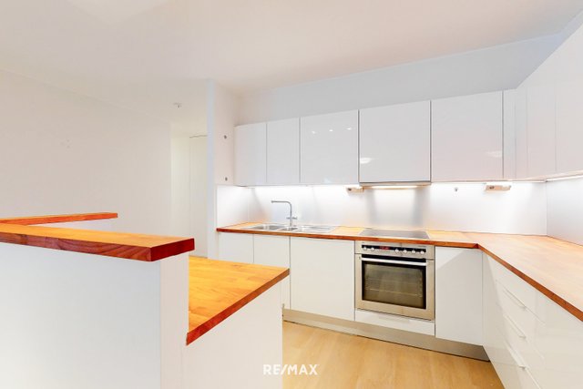 - Vaaleansävyinen avokeittiö. jossa runsaasti kaappi- ja laskutilaa. Keittiön varustuksiin kuuluu jääkaappi, integroitu pakastin, integroitu tiskikone, liesitaso, kalusteuuni ja liesituuletin. Mukavuutta lisää erillinen saareke. Tasot ovat puuta ja välitila kalustelevyä. Lattiat ovat vinyylilankkua ja seinät maalattu.