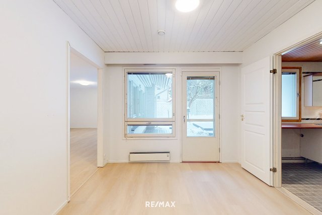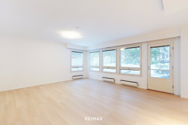 - Tilava ja valoisa olohuone, jossa on vinyylilankkulattia ja maalatut seinät. Olohuoneesta käynti pihalle.