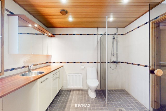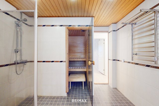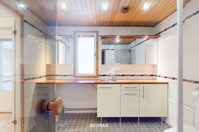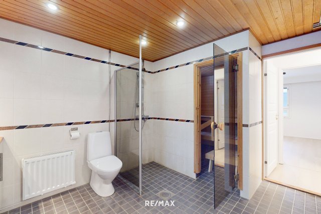 - Tilava kylpyhuone, jossa seinät ja lattia ovat laatoitettu. Kylpyhuoneen varustuksiin kuuluu suihku, suihkuseinä, käsienpesuallas, allaskaappi, pyyhekuivain, patteri, wc-istuin ja tilavaraus pesukoneelle sekä kuivausrummulle. Kylpyhuoneesta käynti saunaan. Kylpyhuoneen lattialämmitys ei toimi.