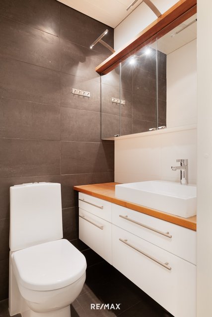 - Erillisessä wc:ssä on wc-istuin, käsienpesuallas, allaskaappi ja peilikaapit. Seinät ja lattia ovat laatoitettu. Mukavuutta lisää lattialämmitys.